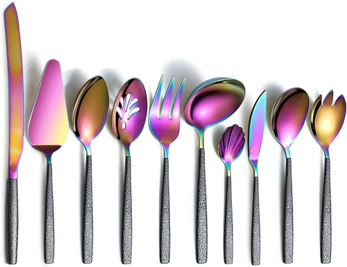 Juego de 10 cucharas de servir que incluye: 1 cuchara para servir, 1 cuchara ranurada, 1 tenedor de carne fría, 1 cuchara de azúcar, 1 servidor de pastel, 1 cuchillo para pastel, 1 cuchillo de mantequilla, 1 cucharón de salsa, 1 cuchara para ensalada, 1 tenedor de ensalada. Perfecto para eventos especiales, fiestas, cumpleaños, bodas, etc. También es perfecto para el uso diario. Material de alta calidad duradero y no se oxida: este juego de cubiertos está hecho de acero inoxidable de alta calidad, no se dobla; resistente a la corrosión, sin plomo, sin cadmio, sin ftalatos, sin BPA, duradero y ecológico, sin puntos ásperos para dañar tu boca. Son perfectos para cualquier fiesta, boda, cumpleaños o eventos especiales. Acabado de lujo y alta calidad: el juego de cubiertos es pulido con acabado de espejo y chapado con titanio Rainbow y mango negro de Mars. Se ve lujoso y hermoso. Son una hermosa decoración de tu mesa, y eleva tu cena. Diseño ergonómico: el mango de la superficie de Marte se fijará en tu mano cómodo y bien equilibrado. Gracias a su elegante diseño moderno, quedará sobresaliente en tu mesa. Apto para lavavajillas: este juego de cubiertos es apto para lavavajillas, puedes ponerlos en un lavavajillas y salen para ahorrar tiempo. Asegúrese de no utilizar el detergente duro
