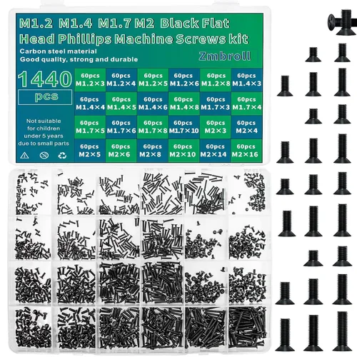 El paquete incluye: 1440 tornillos Phillips de cabeza plana (+/-2%) en una práctica caja. Contenido: M1.0.079 x 0.118 in --- --- 60 unidades. M1.0.079 x 0.157 in --- --- 60 unidades. M1.0.079 x 0.197 in --- --- 60 unidades. M1.0.079 x 0.236 in --- --- 60 unidades. M1.0.079 x 0.315 in --- --- 60 unidades. M1.0.157 x 0.118 in --- --- 60 unidades. M1.0.157 x 0.157 in --- --- 60 unidades. M1.0.157 x 0.197 in --- --- 60 unidades. M1.0.157 x 0.236 in --- --- 60 unidades. M1.0.157 x 0.315 in --- --- 60 unidades. M1.0.276 x 0.118 in --- --- 60 unidades. M1.0.276 x 0.157 in --- --- 60 unidades. M1.0.276 x 0.197 in --- --- 60 unidades. M1.0.276 x 0.236 in --- --- 60 unidades. M1.0.276 x 0.315 in --- --- 60 unidades. M1.0.276 x 0.394 in --- --- 60 unidades. M2 x 0.118 in --- --- 60 unidades. M2 x 0.157 in --- --- 60 unidades. M2 x 0.197 in --- --- 60 unidades. M2 x 0.236 in --- 60 unidades. M2 x 0.315 in --- --- 60 unidades. M2 x 0.394 in --- --- 60 unidades. M2 x 0.551 in --- --- 60 unidades. M2 x 0.630 in --- --- 60 unidades. Especificaciones: Nombre del producto: Tornillos de máquina Material: Acero al carbono Tipo de rosca: tornillos de máquina. Sistema de medición: métrico Tipo de tornillo: Phillips Color: negro Estos tornillos de cabeza plana negros tienen dimensiones estándar, superficie lisa y limpia. Tenemos 24 tamaños para ti, puedes elegir los tamaños que necesitas, suficiente para que los uses en casa o en el trabajo. Hecho de acero al carbono de alta calidad, tornillos negros, con alta dureza, anticorrosión y buena estabilidad Amplias aplicaciones: estos tornillos de máquina de cabeza avellanada cruzada son una buena opción para electricistas, adecuados para el hogar, la industria de equipos de oficina, la industria electrónica, la industria de las comunicaciones, maquinaria o cualquier otra cosa que requiera tornillos pequeños, etc. Nota: Piezas pequeñas, mantenga alejado de los niños menores de 6 años