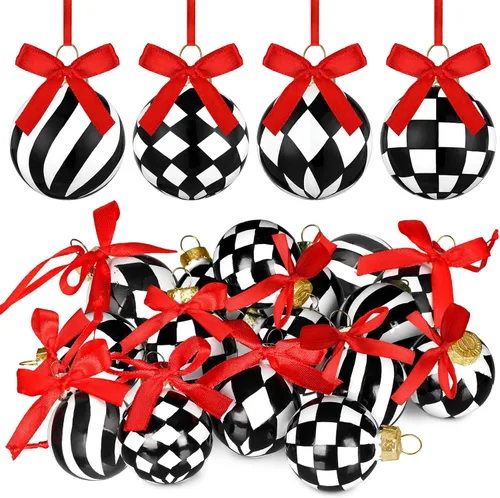 Wettarn 24 adornos de Navidad de vidrio blanco y negro con lazo de vidrio a cuadros, bolas colgantes para árbol de Navidad con cuerda para decoración
