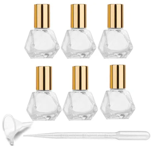 Material: cuerpo de botella de vidrio grueso y bolas de acero inoxidable; Color: botellas transparentes y tapa dorada Capacidad: 0.2 fl oz (1/6 oz), tamaño pequeño suficiente para llevar en su bolsa de viaje para actividades diarias y viajes prolongados La tapa de rosca se ajusta firmemente y puede prevenir eficazmente cualquier fuga de líquido Diseño poligonal, de alta calidad y moda, idea para hacer tus propios aceites esenciales, aceite de síntesis, esencia, perfumes, bálsamos labiales, aromaterapia, fragancias y otros líquidos cosméticos, satisface tus necesidades de cuidado diario para ojos, caras y cuerpo El diseño de bolas de rodillo tiene un efecto de masaje, con nuestras botellas de rodillo de vidrio de aceite, puedes disfrutar de cada momento durante el masaje o salones de belleza