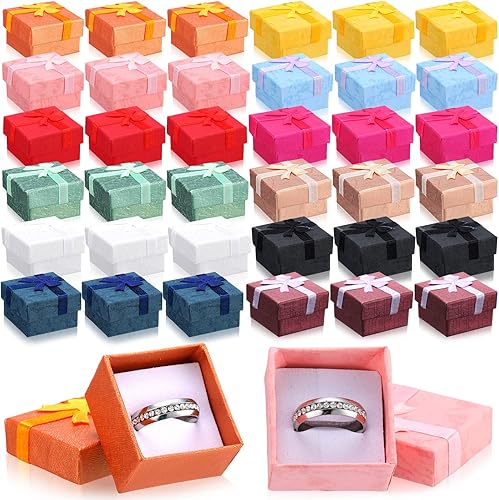 cartón y esponja Contenido del paquete: recibirás 72 cajas pequeñas de joyería para regalos en 12 colores, incluyendo oro, rosa, rojo, azul oscuro, azul claro, morado, amarillo, verde, naranja, rosa claro, blanco y negro, y cada color tiene 12 piezas, que son adecuadas para empacar pequeños regalos, satisfaciendo tus necesidades de uso diario Aspecto bonito: nuestras cajas de anillos para regalo de joyería están diseñadas con bonitos lazos de cinta, que son de color brillante y se ven muy encantadores, no solo se pueden aplicar como cajas de regalo, sino también como cajas de almacenamiento de joyas, puedes poner tus pequeños artículos en ellos, incluyendo anillos, collares y otras joyas pequeñas Largo tiempo de uso: nuestra caja de joyería de regalo está hecha de cartón con una esponja cuadrada en el interior, no es fácil de romper o perder forma, y puede durar mucho tiempo, la esponja puede evitar que tus pequeños artículos se rayen o se muevan Tamaño detallado: el tamaño de nuestra caja para anillos de joyería es de aproximadamente 1.6 x 1.6 x 1.1 pulgadas, y el grosor de la esponja es de aproximadamente 0.55 pulgadas/0.6 in, se puede poner fácilmente en tu bolsillo, ahorrando espacio de almacenamiento cuando viajas, te separas, acampas o vas de viaje de negocios Dulce regalo: puedes utilizar nuestras cajas de collar para empacar tus regalos bien preparados, luego enviarlos a tu marido, madre, padre, amigos o colegas, probablemente se sorprenderán al recibir regalos delicadamente envueltos