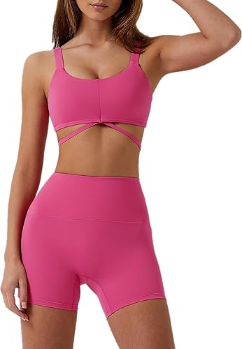ABOCIW Conjuntos de entrenamiento para mujer, 2 piezas, con parte delantera torcida, halter, brasieres deportivos, pantalones cortos de cintura