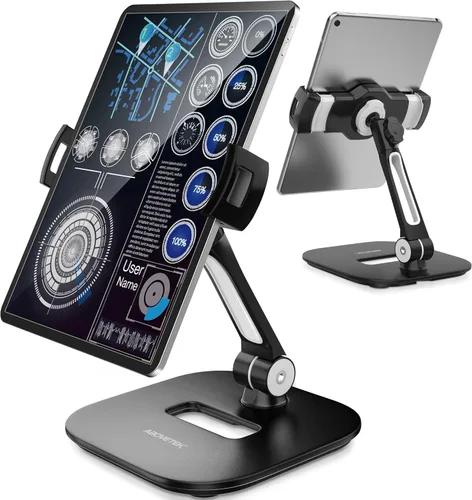 Material resistente: la base y el brazo de metal de aluminio pesado forman una estructura altamente rígida para sostener varias tabletas y teléfonos inteligentes de hasta 2.2 libras con seguridad sin tambaleo y no más dispositivos de caída o inclinación Abrazadera compatible: soporte universal para iPad con abrazaderas en ambos lados se adapta a cualquier tablet PC de pantalla de 4 a 11 pulgadas (iPad Air/Mini/iPad Pro de 9.7 pulgadas, Galaxy Tab, Nexus, etc.) o teléfonos inteligentes (iPhone X 8 y 8 Plus 4/5/6/7/Plus, Samsung Galaxy, etc.) con una fuerte potencia de sujeción y protección de goma completa Ajuste flexible: el soporte de rotación de 360° y la base del brazo más el rango de plegado de brazo de 150° crean numerosos ángulos de visualización en todas las dimensiones, un soporte para iPad imprescindible para el entretenimiento en el hogar, tiendas que se muestran como soporte cuadrado, exhibición de oficina. Comodidad perfecta de manos libres para personas mayores en casa que disfrutan de la tecnología moderna Diseño considerado: la forma simple y ergonómica hace eco con sus elegantes dispositivos tecnológicos en armonía, con recortes especiales tanto en el soporte como en la parte inferior de la base para el cable de alimentación de la carcasa, un verdadero soporte para tableta que presta gran atención a los detalles para sus usuarios Aplicación versátil: funciona como soporte para iPad Mini para escritorio o dispositivo móvil para teléfono celular. Con un adaptador de cámara réflex digital de ¼" incluido como valor adicional, se transforma en un trípode o un soporte para proyector con tantas posibilidades de uso. El ajuste de la estanqueidad de la base del brazo con la llave hexagonal incluida garantiza una estabilidad sin igual como estación de acoplamiento para convertir el iPad en pantalla interactiva