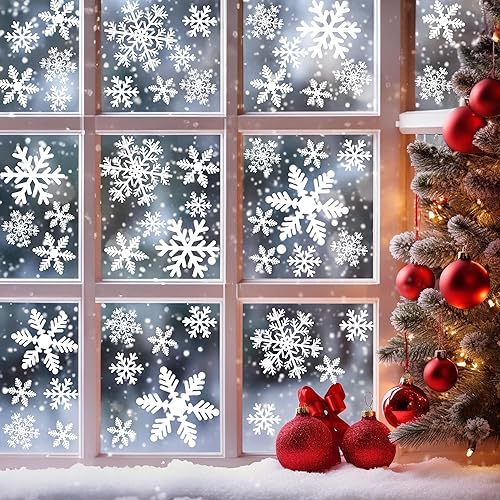 Diseño: cada calcomanía de Navidad mide aproximadamente 14 x 20 pulgadas, y contiene cuatro tamaños (aproximadamente 1.8 x 2.2 pulgadas, 2.8 x 3.1 pulgadas, 3.4 x 4.3 pulgadas, 4.3 x 4.3 pulgadas) y diferentes formas de calcomanías blancas de copo de nieve. Reutilizable: estas calcomanías decorativas de copo de nieve están hechas de material de PVC electrostático y no contienen pegamento. Se pueden reutilizar y quitar fácilmente sin ningún residuo de desplazamiento. Multiusos: estas películas de decoración de copo de nieve para ventana son adecuadas para ventanas interiores del hogar, escaparates, Navidad y otras decoraciones de fiesta, para crear un país de las maravillas invernales. Características: no adhesivo; extraíble; inodoro; visibilidad de doble cara; uso repetido. [Métodos de uso]: limpia la ventana, rocía una pequeña cantidad de agua sobre el vidrio, retira las calcomanías de copo de nieve que quieras y pégalas en el vidrio.