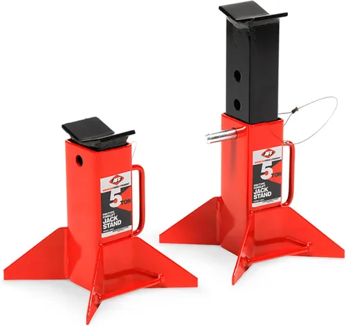 Par de soportes Jack de 5 toneladas: los soportes para gatos AFF de 5 toneladas (10,000 libras) vienen con una base resistente de 9" x 10". Ideal para centros de servicio de automoción, flotas, equipos agrícolas o de construcción. Incluye 2 soportes para gatos ALTURA AJUSTABLE: Un sistema de seguridad crítico para ayudar a asegurar la carga, el poste tipo pin se ajusta a 4 posiciones de altura de 13" a 17" CERTIFICADO: Cumple con las normas ANSI y PALD Estable: sillines de soporte extra grandes de 2.75" x 4" para su uso con vehículos de carrocería unificada, proporcionan durabilidad y longevidad Especificaciones: 29 libras de peso de la nave por par, 2.75"x4" sillines de soporte, base de 9"x10"