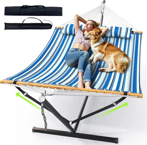 Hamaca resistente para dos – 500 libras de capacidad: construida con un soporte de acero reforzado y tela de hamaca duradera, esta hamaca doble soporta hasta 500 libras, ofreciendo una resistencia, estabilidad y tranquilidad fiables para dos adultos que se relajan juntos. Diseño de correa equilibrada para una mayor estabilidad: con una correa de equilibrio integrada, esta hamaca ayuda a reducir el balanceo lateral y la inclinación en comparación con las configuraciones estándar de hamaca, creando una experiencia de descanso más segura y estable para relajarse, leer o pasar tiempo con la familia. Altura ajustable para colgar para una comodidad personalizada: equipada con fuertes cadenas de acero, la hamaca te permite ajustar fácilmente la altura de suspensión para que coincida con tu posición de descanso preferida. Disfruta de una comodidad personalizada sin cambiar o ajustar la estructura del soporte. Tela suave y transpirable con almohada desmontable: la hamaca ancha está hecha de tela suave y transpirable que distribuye uniformemente el peso para una mayor comodidad. Incluye una gran almohada desmontable para proporcionar un apoyo adecuado para la cabeza y el cuello durante la relajación prolongada. Montaje sin herramientas y uso versátil en interiores: diseñado con un simple sistema de hebilla y botón de resorte, el soporte de hamaca se monta rápidamente sin herramientas y es fácil de quitar y almacenar. Ideal para patios, jardines, patios, campamentos o viajes a la playa, y adecuado tanto para espacios de ocio al aire libre como en interiores.
