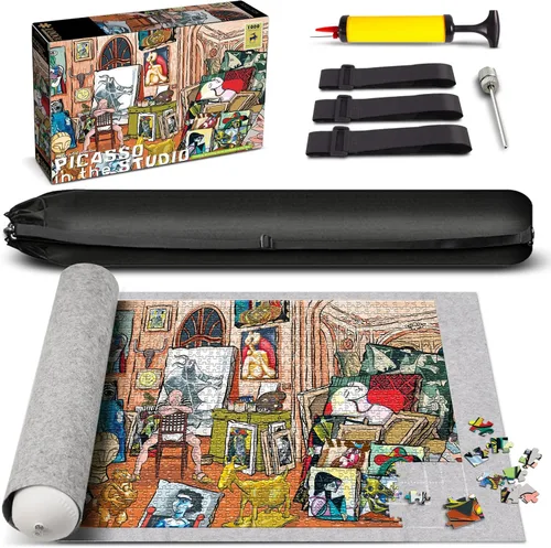 【Artículo 1】Juego de 5 alfombrillas de rompecabezas: 1 alfombrilla de fieltro antideslizante, 1 tubo inflable, 1 bomba de mano, 1 bolsa de almacenamiento, 3 correas de velcro ajustables. Mide 45.6 x 26 pulgadas (45.7 x 26.0 in), el tapete tiene capacidad para hasta 1500 piezas de rompecabezas. Artículo 2: rompecabezas de estudio de Pablo Picasso de 1000 piezas para adultos. Rompecabezas de estudio Pablo Picasso de 1000 piezas Calidad prémium: cada pieza está impresa con tintas sin esmalte, no tóxicas. Puzzle Greyboard contiene un 90% de papel reciclado. El embalaje contiene un 70% de papel reciclado. Se entrelaza fácilmente: Antelope utiliza cartones de alta calidad para la producción de rompecabezas para garantizar que cada pieza del rompecabezas esté libre de polvo, gruesa, resistente y duradera. Cada pieza tiene el mismo grosor, lo que hace que los rompecabezas sean más fáciles de montar. Las piezas fueron cortadas con precisión. Tamaño terminado: 29.5 x 20.5 pulgadas