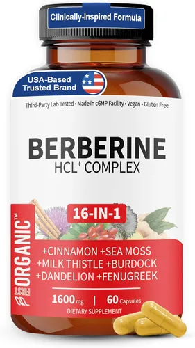 Berberine HCL+ Complex 1600mg - 60 cápsulas - Apoya la salud cardiovascular, hepática e intestinal con canela de Ceilán, cardo mariano y mezcla