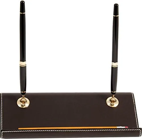 Soporte doble para bolígrafo de cuero marrón coco con detalles chapados en oro.