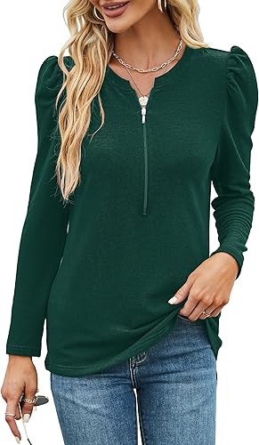 Blusa de manga abombada para mujer, blusa casual de manga larga con cuello con cremallera