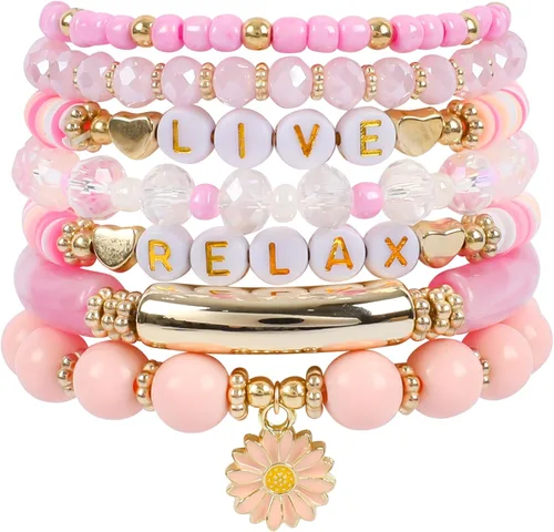Pink Bracelets Purple Bracelet Boho Multi-Layer Beaded Stacking, Versatile Strand Stretch Crystal Beads Wrap Slip-on Cuff Bangle Set, Cute Friendship Bracelets for Women Trendy