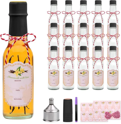 Juego completo para un fácil embotellado: cada juego incluye tapas de rosca e inserciones de plástico con cápsulas retráctiles para evitar fugas para un sellado seguro, y etiquetas para una fácil personalización. El bolígrafo incluido te permite escribir notas personales o detalles del producto en las etiquetas. Un embudo de acero inoxidable garantiza un fácil llenado sin derrames, mientras que el cordel de yute rojo añade un toque rústico para regalar o vender. Este juego es perfecto para cualquier persona que quiera embotellar sus creaciones con facilidad y estilo. Botellas versátiles de salsa picante de 5 oz: estas botellas de vidrio de 5 oz son perfectas para embotellar salsas picantes caseras, aderezos, jarabes y extractos. Las botellas woozy transparentes dan un toque profesional a tus productos mientras muestran los colores vibrantes de tus líquidos. Su tamaño compacto de 5 oz las hace ideales para condimentos de tamaño de viaje, recetas de lotes pequeños y propósitos de regalo. Botellas de vidrio de alta calidad de 5 onzas con tapas: las botellas de salsa están hechas de vidrio duradero de alta calidad, estas botellas de 5 onzas con tapas están diseñadas para mantener la frescura de tu salsa picante u otros líquidos. Tamaño: 1.02 pulgadas en el ancho de apertura, y la altura de 6.78 pulgadas garantiza una presentación elegante y profesional, mientras que la capacidad de 5 onzas es ideal para porciones controladas. Perfecto para la elaboración de vino y extractos caseros: estas pequeñas botellas para vino con tapas se pueden usar para más que solo salsas. Son ideales para embotellar extracto de vainilla, aceites esenciales, jarabes, pequeñas tandas de vino e incluso licores caseros. El diámetro de 4.75 cm en la base ofrece estabilidad, asegurando que las botellas no se vuelquen fácilmente. El diseño clásico y elegante también las convierte en una gran opción para ocasiones especiales, como bodas, cumpleaños o conjuntos de regalos. Múltiples usos en cualquier proyecto de embotellado: estas botellas woozy proporcionan una solución práctica para embotellar tus creaciones, perfectas para regalar o vender productos caseros, los accesorios añadidos hacen que sea fácil personalizar cada botella con toques creativos. Utilízalas para embotellar salsa picante, aceites o incluso para hacer regalos personalizados.