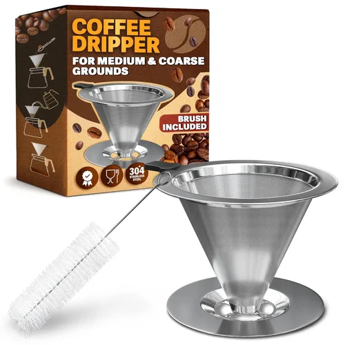 Filtro de café de acero inoxidable: Disfruta de un café perfecto con nuestro gotero de café con punta de cono de acero inoxidable, diseñado para una distribución uniforme del agua y la extracción completa de partículas de café Mejor sabor con el gotero de café Pourover: el método de preparación de goteo lento de nuestro filtro de café reutilizable retiene aceites y grasas para mejorar el sabor para una experiencia de café verdaderamente rica Verter seguro del café por goteo: el amplio soporte de nuestros filtros de café reutilizables de acero inoxidable ofrece estabilidad durante la elaboración. Se adapta perfectamente a la mayoría de tazas y cafeteras, para una preparación sin complicaciones Cono de filtro de café de acero inoxidable reutilizable: nuestro gotero de café de acero inoxidable elimina la necesidad de filtros de papel, reduciendo los residuos y ofreciendo una preparación de café respetuosa con el planeta Fácil de limpiar: mantén nuestro juego de goteros de café de acero inoxidable limpio con facilidad. Utiliza el cepillo incluido, enjuágalo o coloca nuestro colador de café para verter sobre la taza en el lavavajillas para una fácil limpieza