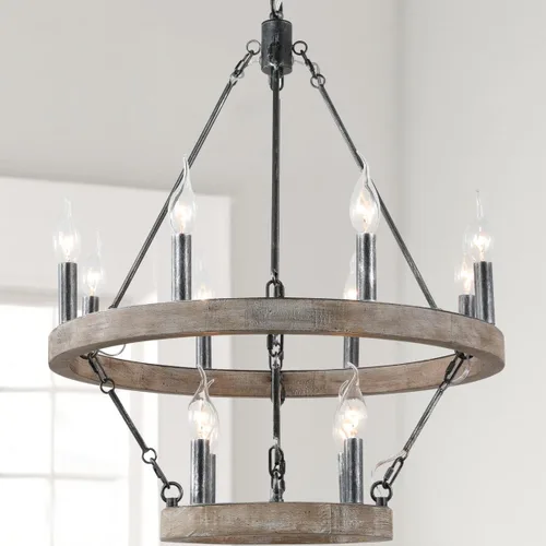 Candelabro de rueda de carro, de madera, granja, de 2 niveles, 12 luces, vestíbulo, cocina, comedor, rústico, redondo, lámpara colgante para colgar