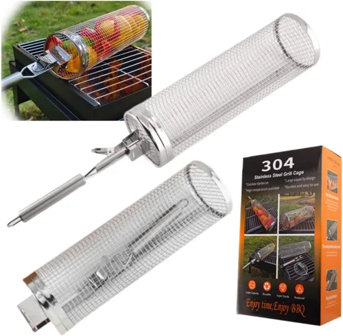 [Nueva versión con mango extraíble] Nuestra cesta de parrilla con ruedas es una versión actualizada con asa, evita quemaduras a mano, conveniente para asar a la parrilla que otros estilos. Hecho de acero inoxidable sólido de grado alimenticio de alta calidad, resistencia a la corrosión y al calor, perfecto para asar a gas, electricidad y carbón, la forma del cilindro permite una mejor circulación del calor y la comida está bien cocinada. Ideal para picnics, fiestas, camping, etc. Conviértelo en un accesorio imprescindible para los entusiastas de la parrilla. [Menos trabajo, menos tiempo] Con un diseño rodante, esta canasta para asar se puede girar fácilmente por el mango, asegurando que tu comida se ase uniformemente y elimina la necesidad de voltear constantemente. Ahorra tiempo de girar cada pedazo de comida, puede asar más alimentos al mismo tiempo en un espacio más pequeño. Ahora puedes cocinar fácilmente para más personas en menos tiempo con nuestras parrillas enrollables. [Fácil de usar] Tamaño: 11.81 x 3.74 x 3.74 pulgadas. Tamaño conveniente para poner comida en la canasta, luego cierre la tapa y colóquela en la parrilla. La tapa no se caerá del cilindro, la jaula de parrilla evita que todos los alimentos asados se caigan de la parrilla. Perfecto para todos los alimentos: utiliza este cilindro de malla de acero inoxidable para asar todo tipo de alimentos. Por ejemplo, col rizada, papas fritas, albóndigas, salmón, adecuado para bistec, pescado, camarones, cebolla, espárragos e incluso postres de fruta fresca, etc. Las verduras y frutas no se quemarán con nuestra cesta para asar. Fácil de limpiar: la parrilla enrollable es apta para lavavajillas. Ayuda a mantener la parrilla limpia y es fácil de limpiar, solo tienes que fregar o ponerla en el lavavajillas, para que brille, frotarla con una almohadilla de lana de acero previamente jabonada.