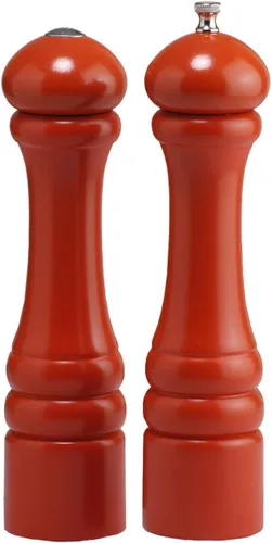 Juego de molinillo de pimienta y salero de 10" - 26cm con acabado naranja Chef Professional Series; construido para el chef con mentalidad de rendimiento Nueva Inglaterra Madera dura Mecanismo de pulido de acero inoxidable totalmente ajustable; garantizado de por vida Fabricado con orgullo en Estados Unidos