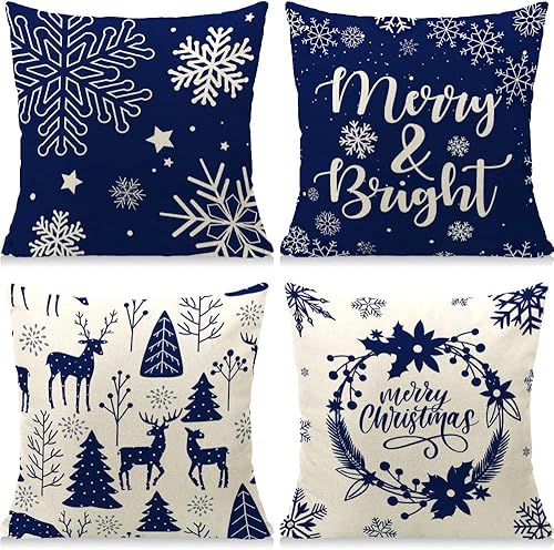 Cirzone Juego de 4 fundas de almohada navideñas de 18 x 18 pulgadas, fundas de almohada navideñas de lino rústico, decoración navideña para cama