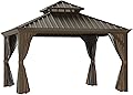Outsunny Cenador de techo rígido de 12 x 12 pies con cortinas y red, toldo permanente de metal de doble techo con marco de aluminio y ganchos, para