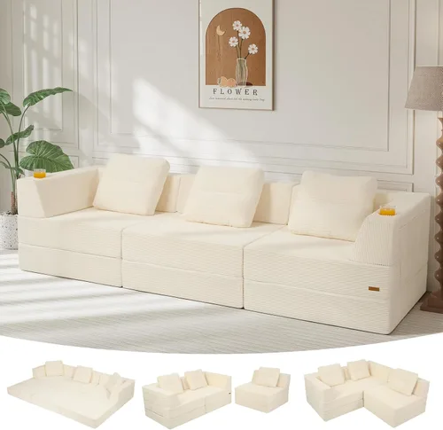 Sofá cama convertible 4 en 1, diseñado para una máxima flexibilidad, este sofá cama plegable se transforma fácilmente en una cama de gran tamaño, colchón de descanso, sillón plegable sin hueso o sección personalizada. Reposabrazos extraíbles, respaldo Soporte ergonómico y cómodo, sofá futón diseñado para adaptarse a las curvas naturales del cuerpo, este sofá cama de 3 plazas cuenta con un respaldo en ángulo, cojines de espuma viscoelástica para soporte de cadera y muslo, y almohadas de apoyo para la alineación de la cintura Pana de alta calidad y soporte duradero, este sofá cama está fabricado con tela de pana suave y aterciopelada que resiste el desgaste diario y los arañazos de las mascotas, este sofá cama se combina con esponja de alta densidad para una comodidad similar a la de una nube que mantiene su forma Diseño que ahorra espacio, este sofá cama plegable se convierte fácilmente en un colchón de suelo compacto, ideal para descansar, jugar o alojar invitados mientras maximiza el espacio en apartamentos pequeños, dormitorios o habitaciones multiusos, sofás pequeños para espacios pequeños No requiere montaje, listo para usar sin necesidad de herramientas ni configuración. Simplemente desempaca y despliega el sofá plegable, permite que de 48 a 72 horas recupere completamente y disfruta de una comodidad instantánea, perfecto para espacios de vida flexibles y modernos