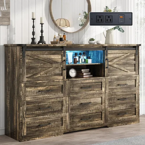 Cómoda grande de 9 cajones de 63 pulgadas: esta cómoda de granja viene con 9 cajones de deslizamiento suave y 2 puertas correderas de granero que ahorran espacio y 2 cubos abiertos con estante ajustable que permite un almacenamiento flexible de artículos de diferentes tamaños. La cómoda grande para puertas corredizas de granero añade significativamente un espacio de almacenamiento más flexible para almacenar tu ropa de cama, ropa, cosméticos, joyas y mantas Organizador de tocador LED: la cómoda de madera de granja con tiras de luz LED multifuncionales, hermosa luz LED RGB multicolor, los colores y el brillo se pueden ajustar a través de la aplicación del teléfono y el controlador de RF. Puedes configurar el brillo, el color, el modo y la función de temporización, y diseñar tu espectáculo de luz al contenido de tu corazón, crear ambiente mientras que hace que sea más fácil encontrar tus pertenencias en la oscuridad Aparadores de granja: esta cómoda de 43 pulgadas de alto presentaba una estética ricamente rústica, una gran fusión de belleza de granja y utilidad del espacio de almacenamiento. La puerta corredera de granero con pista de deslizamiento suave hace que sea conveniente para cualquier persona abrir y cerrar con el mínimo esfuerzo. La textura natural de la madera aporta una sensación de autenticidad y carácter a tu espacio vital, mientras que el diseño vintage añade un toque de nostalgia y estilo Fácil de montar y resistente: la cómoda de 9 cajones viene con instrucciones (idioma español no garantizado) y etiquetada, también proporcionamos un video de instalación para que instales la cómoda con éxito más fácil paso a paso. Organizador de almacenamiento hecho de tablas de calidad y base estable para garantizar la longevidad, la cómoda es fácil de limpiar con un trapo húmedo. Y el organizador de almacenamiento de armario está equipado con un dispositivo antiinclinación, por lo que es más seguro
