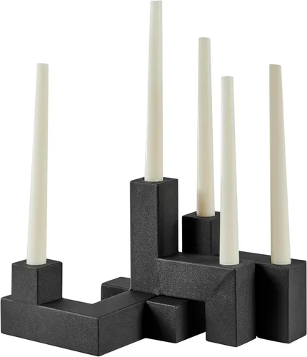 El diseño único superpuesto apilado permite múltiples configuraciones de este juego único de centro de mesa Capacidad para hasta cinco candelabros cónicos en dos candelabros apilables estilo candelabro Diseño ultra contemporáneo con elegantes formas industriales que ofrece centros de mesa audaces pero minimalistas Construcción de metal resistente en negro mate fresco que complementa cualquier mesa moderna o superficie de estantería Ofrece un regalo ideal de inauguración de la casa, recién casado u otra ocasión especial para cualquier amante de las velas