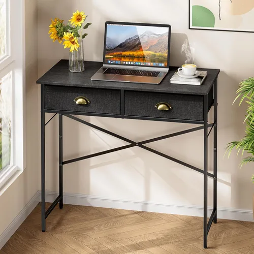 Escritorio pequeño para niños: este es el escritorio pequeño perfecto si tienes espacio limitado, el tamaño del escritorio es de 15.7 pulgadas de profundidad x 31.5 pulgadas de ancho x 31 pulgadas de alto, adecuado para la mayoría de espacios pequeños como dormitorio, habitación de los niños, camas altas para niños, dormitorio, etc. El escritorio se puede utilizar como escritorio de escritura, escritorio de estudio, escritorio de juegos o como tocador con cajones. Si quieres un escritorio pequeño, esta es la mejor solución 【Escritorio con cajones de tela】El pequeño escritorio de oficina viene con 2 cajones de tela es una buena idea para almacenar cosas pequeñas y ligeras; un cajón puede guardar dispositivos electrónicos para niños como AirPods, iPad, cargador, consola de juegos, ratón, otro cajón se utiliza para papeles sueltos, carpetas de archivos, cuadernos, cartulina, lápices, calculadora, etc. para mantener el pequeño escritorio ordenado 【La eficiencia se une a la elegancia】La combinación de madera retro y metal fuerte hace que la pequeña estructura de escritorio de oficina en casa sea más estable y resistente, usa la barra transversal en forma de X y el soporte diagonal para reforzar el marco. No se deforma ni agita fácilmente, las almohadillas ajustables para las patas mantienen la mesa de estudio estable en suelos irregulares 【Simple y ligero】 La superficie del escritorio está hecha de 3 piezas de laminado de alta calidad que resiste arañazos y manchas, lo que facilita su mantenimiento. Es un escritorio excelente con un tamaño cómodo, ideal para niños, adolescentes y estudiantes como mesa de estudio en casa, así como para profesores que trabajan en su oficina en casa con una laptop 【Fácil montaje】 El escritorio de oficina viene con instrucciones detalladas y todas las piezas están claramente etiquetadas para un montaje fácil. Si tu escritorio llega dañado, con piezas faltantes o rayado, nuestro equipo profesional de atención al cliente te ayudará a resolver el problema en 24 horas