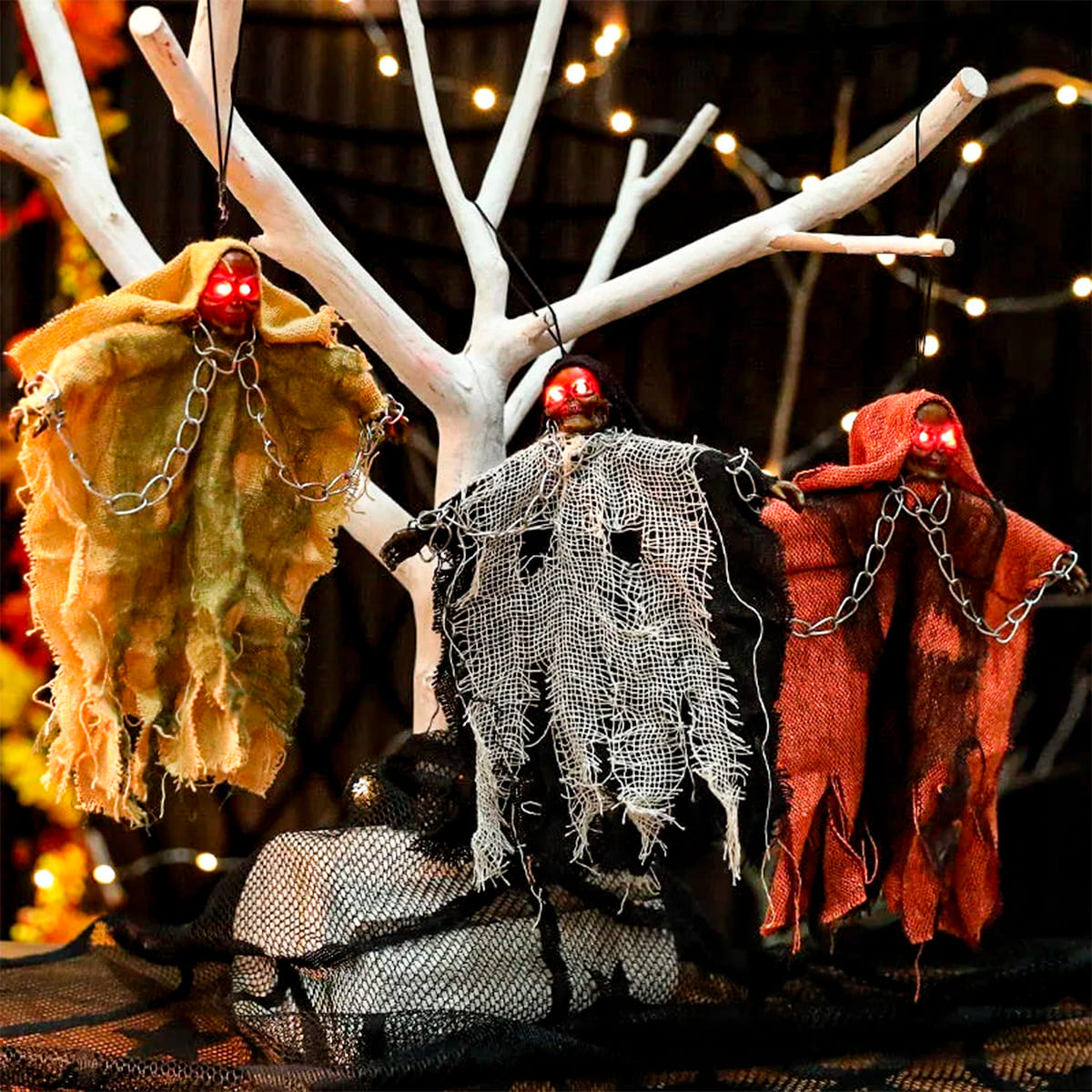 🎃 Incluye 3 diseños diferentes con telas envejecidas y cadenas metálicas.