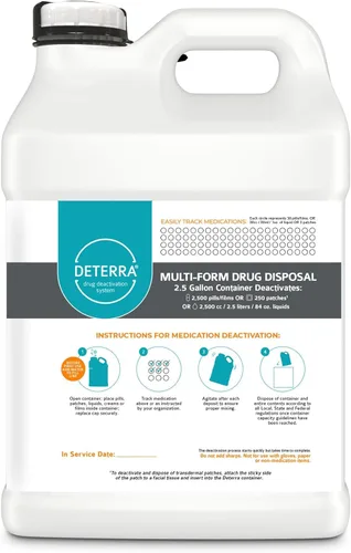 Eficaz: El ÚNICO contenedor de desactivación de fármacos científicamente probado para funcionar. El recipiente de desactivación de fármacos proporciona una eliminación segura, conveniente y permanente de medicamentos no utilizados, caducados o no deseados en el hogar o en un entorno clínico. Cada recipiente se desactivará y desechará hasta 2.500 píldoras, 84oz/2.5L o 250 parches a la vez. Seguro de usar: Nuestro contenedor de desactivación de medicamentos utiliza ingredientes no tóxicos que desactivan completamente los medicamentos que evitan que los productos químicos dañinos lleguen a niños, mascotas u otros amigos y familiares. Fácil de usar: el proceso patentado de tres pasos funciona con carbón activado orgánico patentado y funciona en tres sencillos pasos (1) Abre el recipiente y coloca el medicamento en el interior (2) Llena el recipiente hasta la mitad con agua tibia. Espera 30 segundos (3) Selle el recipiente herméticamente, agite suavemente y arroje la basura doméstica normal Industrias: Nuestros contenedores de desactivación patentados se utilizan en el hogar o en un entorno clínico y son confiables, internacionalmente, por organizaciones gubernamentales, sistemas hospitalarios, farmacias, sindicatos y grupos de empleadores, solo por nombrar algunos.