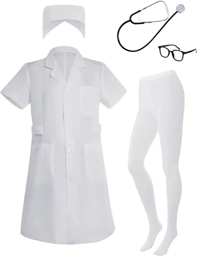 Características 1. El disfraz de enfermera para mujer es duradero. 2. El disfraz blanco de las mujeres de la bata de laboratorio es ajustable 3. Disfraz de doctor para adulto viene con un juego completo. 4. Los disfraces de Halloween para mujer tienen una amplia aplicación. Especificación Material: poliéster, plástico, metal. Tamaño: como se muestra en la imagen. Color: blanco y negro. Cantidad: 4 piezas de disfraz de enfermera para mujer. Contenido del paquete blanco (Short Sleeve White Lab Coat) Sombrero de enfermera blanco estetoscopio enfermera Calcetines blancos negro (Black Glasses Frame)