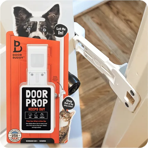 Deja que los gatos entren y mantiene a los perros fuera: el Door Buddy Cat Door Prop es la manera fácil, conveniente y segura de mantener la puerta entreabierta para que el gato entre mientras que también la mantiene lo suficientemente estrecha como para mantener al perro fuera de la habitación (si es ligeramente más grande que el gato). Fácil de usar: simplemente gira la perilla o el asa desde cualquier lado para abrir la puerta y entrar en la habitación. No puede ser más fácil que eso. Nada que enganchar y desenganchar manualmente cada vez que entres a la habitación. Volver a colocar en la posición de apoyo es aún más fácil... simplemente empuja o tira la puerta cerrada hasta que el soporte de pestillo de puerta Door Buddy se enganche automáticamente al émbolo de la puerta. ¡Eso es todo! Instalación Simple, No Permanente y Portátil - Remueva la placa de refuerzo existente del marco de la puerta y reemplácela con la placa de refuerzo Door Buddy utilizando los tornillos existentes. El soporte de puerta Door Buddy para gatos no requiere ningún adhesivo, corte o hacer nuevos agujeros en tu puerta, por lo que es extraíble, reutilizable y la solución perfecta para inquilinos y viajeros por igual. El resultado: una caja de arena para gatos a prueba de perros en segundos. Ancho ajustable: nuestra placa patentada y soporte de pestillo de puerta te permiten ajustar el ancho de la abertura de la puerta para mantener la puerta entreabierta entre 3 y 5.5 pulgadas para que puedas personalizarla al tamaño exacto de tus mascotas. Simplemente afloje los tornillos pequeños, deslice las dos piezas al ancho deseado y apriete completamente los tornillos hasta que se bloquee y ya no se deslice. La herramienta Torx T8 se proporciona en el paquete del producto. Fuerte, duradero y sin pinzas - Hecho de materiales gruesos y de alta calidad, lo que lo hace fuerte y duradero para resistir incluso a perros grandes y decididos. Finalmente, un tope de puerta para mascotas, perros, gatos donde no hay "movimiento" cuando está en la posición apoyada, lo que significa que no hay dedos pellizcados, colas y no se bloquea dentro o fuera de las habitaciones. Puerta para gatos sin cortes: la cerradura de puerta ajustable de Door Buddy es la mejor alternativa de puerta interior para gatos que devuelve a los gatos su espacio No hay necesidad de complicadas cerraduras de puerta para niños o cortar una puerta de gatito. Deja de luchar con una pesada puerta para bebés o una puerta para mascotas con puerta para gatos. ¡No puedes encontrar un soporte de puerta más fácil para mantener la puerta abierta / entreabierta que este! Patentado y fabricado en EE.UU. - Door Buddy Pet Door Prop está patentado (#11591836), es propiedad de una pequeña empresa, inventado por padres y fabricado en EE.UU. Y; a diferencia de las opciones más baratas, menos duraderas, importadas y copias de soportes para puertas para mascotas, Door Buddy es el original, es asequible y está fabricado con materiales de alta calidad. Prueba Door Buddy hoy mismo y comprueba por ti mismo por qué miles de dueños de mascotas han amado y confiado en los productos Door Buddy Door Latch desde 2015. Compatibilidad: 1. Funciona con puertas interiores estándar que oscilan a la izquierda y derecha, de 1-3/8 pulgadas de grosor. No compatible con puertas exteriores gruesas, de bolsillo, de granero o de acordeón. 2. Funciona con placa de empotrar estándar con orificios para tornillos a 1-5/8 pulgadas de distancia. 3. No apto para marcos de puertas anchas/extendidas. Mide el agujero del tornillo a la parte delantera del marco de la puerta. Debe tener menos de 1-3/8 pulgadas (imágenes en el listado a continuación). 4. Si hay una pared/armario/electrodoméstico justo contra la abertura de la puerta, es posible que no deje suficiente espacio para los gatitos regordetes.