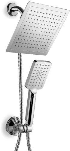Combinación de ducha de lluvia con control de flujo de botón pulsador: utilice un lujoso cabezal de ducha de lluvia para empapar el cabezal de ducha de lluvia, o mima con una nueva ducha de mano de última generación con un práctico control de flujo de botón | Sostenga la ducha de mano y cambie sus ajustes de flujo con la misma mano | Sin dial para girar, simplemente empuja el botón de control de flujo con el pulgar | Coloque la ducha de mano en cualquier lugar la ducha para un fácil acceso y comodidad Cabezal de ducha de lluvia extragrande: cara extra grande de 9 pulgadas para cobertura de flujo de agua de hombro a hombro | Chorros de limpieza por frotamiento para una fácil limpieza | Tuerca de rótula de latón macizo ajustable en ángulo para una conexión confiable sin fugas | Diseño de alta moda | Acabado cromado premium Ducha de mano con control de flujo de botón: se puede utilizar como ducha de mano o ducha de mano | Cara extragrande de 4.75 pulgadas para una cobertura más amplia del flujo de agua | Revolucionario control de flujo de botón para operación con una sola mano (mantenga la ducha de mano y ajustes de flujo del interruptor con la misma mano) | Disfruta de lluvia de alta potencia, masaje de aireación y ajustes de cascada de lujo con solo pulsar un botón, sin dial para girar. Chorros de limpieza por frotamiento para una fácil limpieza | Diseño cuadrado de alta moda | Acabado cromado premium INSTALACIÓN: Instalación sin herramientas. Se conecta en minutos a cualquier brazo de ducha estándar, no requiere herramientas GARANTÍA: Servicio al cliente estándar de oro con política de devolución o cambio instantánea sin complicaciones si no está 100% satisfecho | Garantía limitada de por vida