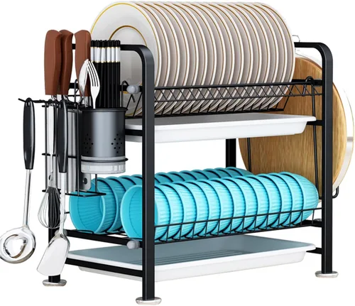 Material de alta calidad: a diferencia de otros fabricantes, nuestro material es de acero inoxidable de alta calidad, con un acabado exterior grueso resistente al desgaste y ecológico. Para ti, eso significa que este escurridor de platos puede durar más que tus platos. Bandeja de goteo extraíble: debajo de cada nivel de este estante de drenaje tiene una bandeja de goteo extraíble, que puede recoger el agua que gotea, manteniendo la encimera seca. Estable y práctico: nuestro escurridor de platos está hecho de acero inoxidable con revestimiento antioxidante, que es fuerte y duradero para un uso a largo plazo. Las patas de goma antideslizantes evitan que el escurridor se deslice y protegen las encimeras de arañazos. Ahorra espacio en la encimera: el escurridor de platos ocupa poco espacio para mantener tus utensilios de cocina como platos, tazas, cuencos, cucharas, cuchillos y tenedores secos y ordenados con facilidad. Perfecto para la encimera de tu cocina. Fácil de montar: el escurridor de platos de cocina es fácil de instalar, no requiere tornillos ni herramientas. Si encuentras algún problema durante la instalación, ponte en contacto con el vendedor para resolverlos por ti.