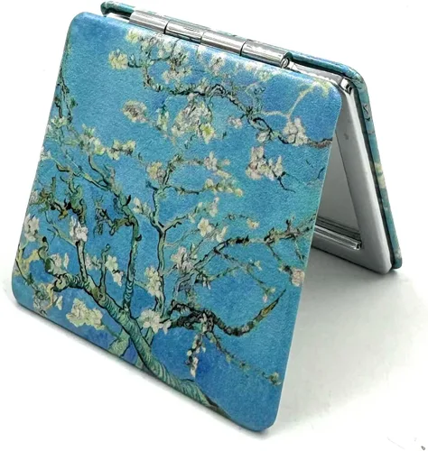 Espejo compacto para mujer hecho de metal envuelto en piel sintética de alta calidad y cuenta con una bisagra plegable que permite que se abra en ángulo de 180 grados. Espejo compacto lindo y pequeño para bolsillo, bolso y uso de viaje. Espejo plegable de mano para niñas con peso ligero. Espejo de mano plegable con espejos de doble cara para maquillaje. El espejo principal refleja perfectamente una imagen clara de toda la cara, mientras que el otro lado está ampliado 2x. Bonito espejo de bolsillo compacto tamaño pequeño: 2.5 "x 2.36" x 0.4" Espejo de maquillaje de bolsillo tamaño para viajes, para mujeres y niñas con impresiones artísticas y belleza floral. Regalos para ella que ama a Van Gogh, la Noche Estrellada, Irises, Claude Monet, Lirios de Agua, Amaneceres, Postimpresionismo, Pintura Abstracta, etc.