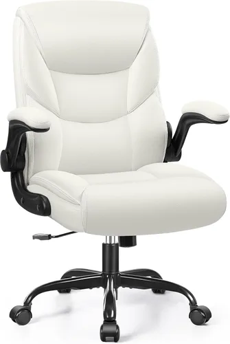 Silla cómoda y ergonómica: nuestra silla de oficina de cuero está diseñada pensando en la ergonomía, proporcionando un apoyo lumbar óptimo y promoviendo una postura saludable. El cojín acolchado garantiza la máxima comodidad durante todo el día, por lo que es perfecto para largos períodos de trabajo o estudio. El diseño de espalda media ofrece soporte equilibrado para tu espalda y hombros Materiales de alta calidad: hecha de piel sintética de alta calidad, nuestra silla de escritorio es duradera y lujosa. La piel sintética es resistente al agua, a los arañazos y fácil de limpiar. El acolchado suave pero resistente proporciona una comodidad inigualable, asegurando un espacio de trabajo relajante y productivo Reposabrazos abatibles y movimiento giratorio suave: La silla de computadora está equipada con reposabrazos ajustables abatibles de 90°. Simplemente levanta los reposabrazos y empújalos debajo del escritorio para ahorrar hasta 1.2㎡ de espacio en tu hogar u oficina. Además, la silla cuenta con un suave movimiento giratorio de 360 grados, lo que permite un movimiento sin esfuerzo alrededor del espacio de tu escritorio Uso versátil: ideal para personas bajas, mujeres o aquellos que buscan una opción compacta para habitaciones más pequeñas, esta silla de oficina ejecutiva se integra perfectamente en cualquier entorno, ya sea una acogedora oficina en casa o un entorno profesional Ruedas suaves y elevador de gas premium: El marco del cojín hecho de madera certificada FSC, Equipada con ruedas premium, nuestra silla de oficina para el hogar se desliza de manera silenciosa y suave a través de varios tipos de piso, evitando arañazos. El elevador de gas certificado BIFMA garantiza un ajuste de altura fiable, mejorando la movilidad y la comodidad en su espacio de trabajo