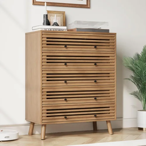 Diseño moderno de mediados de siglo: esta cómoda combina maravillosamente el encanto vintage con un diseño contemporáneo. Con cajón de listones en un acabado de color vintage, aporta elegancia y calidez acogedora a cualquier espacio. Más que un almacenamiento práctico, es una pieza elegante que eleva las salas de estar Gran capacidad de almacenamiento: esta cómoda cuenta con 5 cajones de deslizamiento suave que proporcionan una solución de almacenamiento eficiente. Este armario te ayuda a mantener tu espacio ordenado almacenando cómodamente tu ropa, ropa de cama, cosméticos, joyas y mucho más. Se puede utilizar como una cómoda de ropa, armario multimedia de TV y organizador de entrada Cómoda de madera multifuncional: la mesa de tocador puede mostrar una variedad de artículos decorativos como marcos de fotos, plantas, espejos o televisores. Además de ser una cómoda para tu dormitorio, esta unidad de almacenamiento también se puede utilizar como mesita de noche o mesa auxiliar. Esta cómoda ancha se puede adaptar fácilmente a una variedad de espacios como salas de estar, dormitorios, pasillos, entradas y armarios Construcción resistente y duradera: hecho de madera certificada por CARB/EPA, este armario está construido para durar. La madera proporciona una estructura robusta, mientras que las puertas de listones añaden un toque de naturaleza y transpirabilidad. Con patas de madera maciza que proporcionan una base estable, este mueble está diseñado para ofrecer un soporte fiable, asegurando su funcionalidad a largo plazo Disfruta de un fácil montaje: los muebles Furnify incluyen instrucciones de instalación detalladas para garantizar un proceso de montaje sin complicaciones. Cada pieza y accesorio está etiquetado con un adhesivo numerado para una fácil identificación, y también proporcionamos un paquete de piezas de repuesto para el montaje. Si tienes alguna pregunta, no dudes en ponerte en contacto con nosotros. Nuestro equipo profesional de servicio al cliente estará encantado de servirle y asegurarse de que obtenga una solución satisfactoria