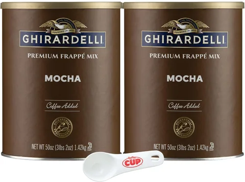 2 latas de mezcla de frappé prémium Ghirardelli Mocha de 3.12 libras 1 cucharada de cacao By The Cup Crea las bebidas congeladas más suaves y sedosas que contienen café colombiano real El estándar de oro para hacer mochas excepcionales y increíbles productos horneados; Kosher El rico sabor de Ghirardelli Frappé es reconocido por profesionales y consumidores como la opción premium para bebidas heladas mezcladas By The Cup es una marca registrada de Terrific Deal, Inc