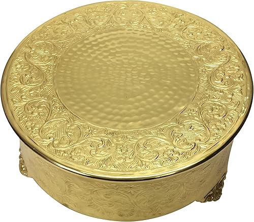CALIDAD PROFESIONAL: Este soporte para pasteles fue hecho a mano por maestros artesanos utilizando solo materiales de la más alta calidad, es ideal para uso profesional. METAL FUERTE: Construido de metal fuerte y duradero, este soporte para pasteles resistirá la prueba del tiempo y se puede utilizar para muchos eventos. Diseño atemporal: el elegante diseño de este hermoso soporte para pasteles en relieve nunca pasará de moda y siempre se puede contar para impresionar a tus invitados. Ajuste óptimo: este soporte redondo para pasteles mide 14 pulgadas de diámetro y mide 6.5 pulgadas de alto. Multiusos: este elegante y hermoso soporte para pasteles fue diseñado para bodas, pero es la manera perfecta de elevar cualquier evento.