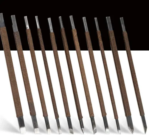 Hecho de acero al manganeso de alta calidad para un uso resistente y duradero, con bolsa para ahorrar fácilmente Este cincel de acero al manganeso es de doble filo, peso y la cabeza es más fina que la talla ordinaria Juego de 11 piezas de herramienta de tallado de piedra con seda envuelta alrededor del exterior, no astringente no se desliza, es una herramienta indispensable Adecuado para principiantes, entusiastas del grabado en madera y estudiantes. Es la herramienta de cuchillo más utilizada por estudiantes de secundaria para grabado y grabados en madera Ideal para capítulos grabados, sellos de piedra, manualidades en madera y pequeñas manualidades decorativas. No apto para jade, porcelana, cristal, adoquín, mármol, piedra azul y otros materiales duros