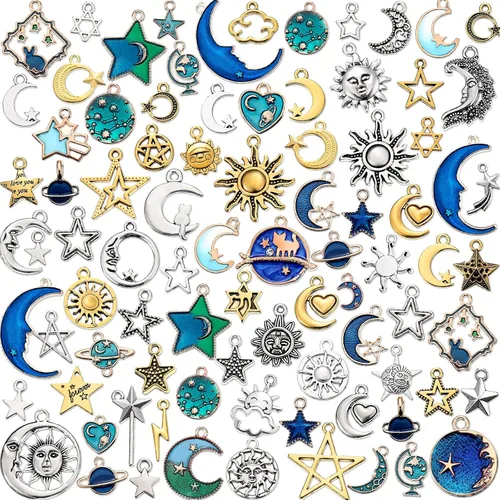 Hicarer 160 piezas dijes para pulseras, dijes mixtos de sol, estrella y luna antiguos, dijes de esmalte plateado celestial para hacer joyas