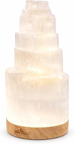 Himalayan Glow Lámpara de cristal selenita de 7.9 in, grande, curvada a mano, con base de madera (certificado ETL) y cable de carga USB