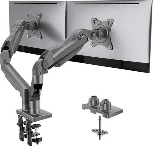 Compatible con pantallas anchas: para garantizar la compatibilidad con el soporte de monitor doble, cada monitor debe cumplir tres condiciones al mismo tiempo: primero, rango de tamaño de pantallas de computadora: 13 a 32 pulgadas. Segundo, rango de peso de la pantalla: de 4.4 a 19.8 libras. En tercer lugar, la parte posterior de la pantalla del monitor debe tener agujeros de montaje VESA con un paso de 75 x 75 mm/3 x 3 pulgadas o 100 x 100 mm/3.9 x 3.9 pulgadas. En cuanto a la compatibilidad con los escritorios: su escritorio debe cumplir tres condiciones al mismo tiempo: Primero, material del escritorio: solo se recomiendan escritorios de madera, no se pueden usar escritorios de plástico o vidrio. En segundo lugar, rango de grosor del escritorio: 0.59" - 3.54". En tercer lugar, la parte inferior del escritorio no debe tener vigas transversales o paneles, ya que esto interferirá con la instalación. Recomendamos comprobar cuidadosamente que su escritorio y monitores cumplen con todas las condiciones anteriores antes de comprar. Sujeción de doble abrazadera en C: ¿Preocupa que sus monitores duales puedan tambalearse o resbalar? Nuestra base mejorada utiliza una plataforma más grande más una estructura de doble abrazadera en C para asegurar firmemente el brazo de doble monitor a su escritorio. Cada brazo mantiene tus pantallas estables de forma segura mientras escribes, haces clic y juegas, sin sacudidas, sin deslizamiento, solo una configuración limpia y segura en la que puedes confiar todos los días. También proporciona una opción de instalación de montaje con ojales, ambas opciones garantizan una fijación estable y segura para tu escritorio de 0.59" - 3.54". Optimice su vista y una amplia gama de movimiento - ¡No más molestias al rotar el ángulo ajustando el tornillo! El excelente brazo de escritorio de diseño hace que se ajuste con una acción tan suave. El soporte del monitor permite que tu monitor gire, se incline y rote. Ve y ajusta libremente tus monitores a un ángulo y posición personalizados. La comodidad es fundamental: nuestro brazo de doble monitor para escritorio eleva los monitores al nivel de los ojos, mejorando la postura, aliviando la tensión en el cuello y los hombros mientras aumenta los niveles de productividad. El diseño de movimiento completo y ajustable en altura te permite trabajar en una posición ergonómica más cómoda.