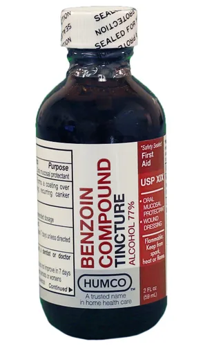 La tintura de benjuí protege la piel de la irritación al formar una barrera protectora sobre el área afectada. Es efectivo para úlceras, escaras y pezones agrietados. Este producto es eficaz para ayudar a aliviar problemas en y alrededor de la boca, incluyendo labios agrietados, encías inflamadas, aftas y herpes labial. La tintura de benzoína también se dice que alivia ciertos malestares respiratorios cuando se agrega a los fluidos del vaporizador. También se puede utilizar como adhesivo para cinta o vendajes. La tintura de benzoína puede aplicarse en el tratamiento de primeros auxilios de cortes y abrasiones menores.