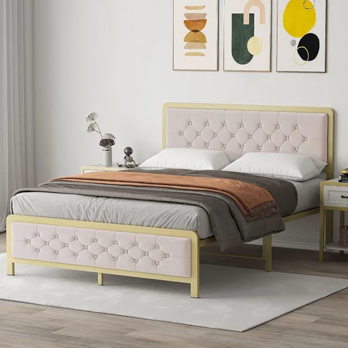 ESTRUCTURA RESISTENTE: Esta robusta base de cama está completamente hecha de marco de metal para una gran capacidad de carga. El marco fiable cuenta con 10 listones de metal entre dos lados, las barras de soporte de las piezas centrales se añaden un marco rectangular para ayudar a estabilizar, lo que te proporciona un fuerte apoyo para un sueño relajante. La superficie con recubrimiento en polvo presenta una resistencia media al óxido y a los arañazos para un uso a largo plazo. Además, no es inestable después de un montaje adecuado. ESTILO DE LUJO: La parte tapizada de la cabecera está hecha de terciopelo de alta calidad y contiene una envoltura de esponja altamente elástica. Revestimiento dorado con pintura dorada para hornear inodora, no solo garantiza la salud y la seguridad, sino que también puede complementar cualquier decoración de tu dormitorio, no importa qué estilo sea tu dormitorio o habitación de invitados, vintage, industrial o moderno, este marco de cama dorado puede adaptarse perfectamente. Diseño sin ruido: este marco de cama con cabecera de esponja. Se añaden tiras silenciosas extra especiales al marco de la cama para garantizar que no se mueva, chirriante ni ruido. El suave acolchado debajo de cada pata de metal evita que tu suelo se raye. Este moderno marco de cama te traerá una noche tranquila. Espacio de almacenamiento: los 12.6 in / 12.6 pulgadas de espacio libre debajo de la cama te proporcionan espacio de almacenamiento adicional para estuches, cajas de almacenamiento u otros suministros. Además, la cama de plataforma de metal se desmonta y ensambla fácilmente para un fácil almacenamiento cuando no está en uso. Fácil de montar: proporcionamos todo el hardware y herramientas necesarios, y un manual de instalación ilustrado para ayudarlo a configurar este marco de cama de hierro. Si tienes alguna pregunta, no dudes en ponerte en contacto con nosotros. (almohadas, edredones, colchones, etc. no están incluidos)