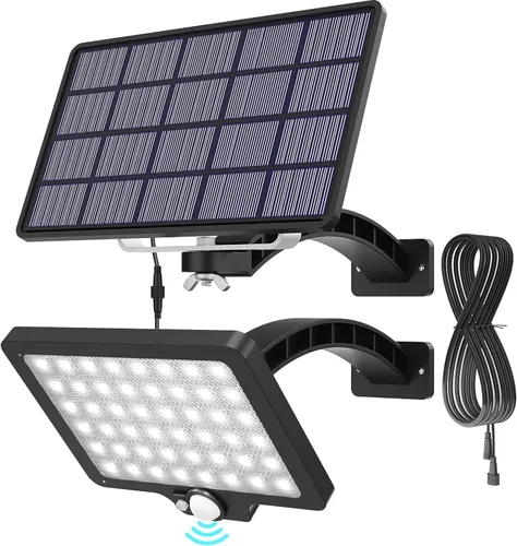 【Rotación de ángulo de 180 grados】: diseñada con soporte montado ajustable de 180 grados para panel y luz, esta luz solar de inundación puede permitirte ajustar el ángulo del panel para adaptarse al lugar donde planeas montar y obtener luz solar completa Apto para interiores y exteriores: esta luz solar de seguridad viene con una instalación flexible, el cable de extensión largo te permitirá dejar la luz en interiores mientras el panel está expuesto al aire libre para absorber la luz solar completa, por lo que es ideal para iluminación interior o exterior, tu cobertizo, granero, porche de techo, puerta, patio, jardín, camino se puede iluminar como quieras. 【3 modos de iluminación disponibles】Esta luz solar de inundación tiene función de sensor de movimiento, modo 1 es tenue a brillante por la noche basado en el movimiento activado; el modo 2 está apagado a brillante con movimiento por la noche y el modo 3 siempre se enciende con la luz sin sensor de movimiento, es decir, modo de atardecer a amanecer Cero factura eléctrica, ahorro de costos: con cuentas mejoradas, esta luz solar puede emitir hasta 1000 lúmenes solo por 48 cuentas LED, soporta áreas de iluminación de hasta 530 pies cuadrados, encontrarás que es una luz extraordinariamente ahorradora de costos para ahorrar tu factura de electricidad Panel solar mejorado, súper brillante: esta luz solar para porche cuenta con un panel de polisilicio mejorado que soporta carga completa solo necesita 4-6 horas durante el día, y una batería más grande de 5500 mAh almacena más energía para soportar la luz de hasta 6 a 10 horas incluso en días lluviosos Resistente al agua IP65, fuerte protección: esta luz solar cuenta con calificaciones IP65 que son calificaciones mínimas recomendadas por expertos para uso al aire libre, puede proteger contra el más alto nivel de polvo y lluvia o depósitos dañinos o electrocución accidental