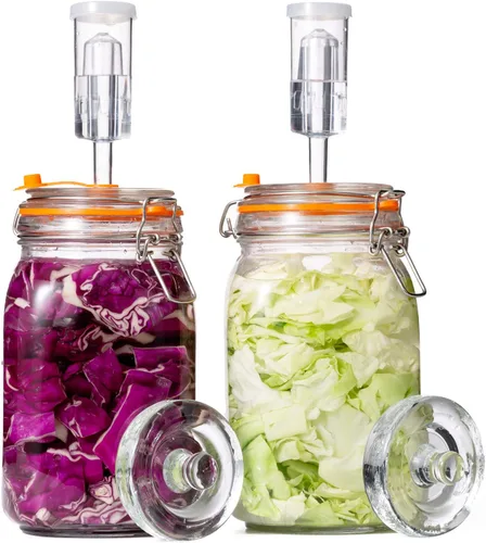 Gran valor: el kit de fermentación de vidrio incluye 2 frascos de fermentación, 2 pesos de fermentación, 2 esclusas de aire, ojales de silicona y sello de silicona, solo necesitas este juego completo para comenzar a fermentar Material seguro: Tarro para chucrut, hecho de vidrio transparente y grueso SIN PLOMO, el tarro para encurtidos es seguro de usar, por favor esterilizar con agua tibia, temperatura menor a 60℃ grados Boca grande: el frasco de elaboración de cerveza con boca ancha y cuello, puedes meter fácilmente tus manos dentro Hermético: Equipado con tapa hermética con bisagras de sello SUS304, con goma de silicona, el kit de fermentador es hermético y perfecto para fermentar chucrut, vino, frutas y cualquier otro vegetal o alimento fermentado que te guste Fácil de usar y fácil de limpiar: el recipiente de fermentación es fácil de instalar y apto para lavavajillas