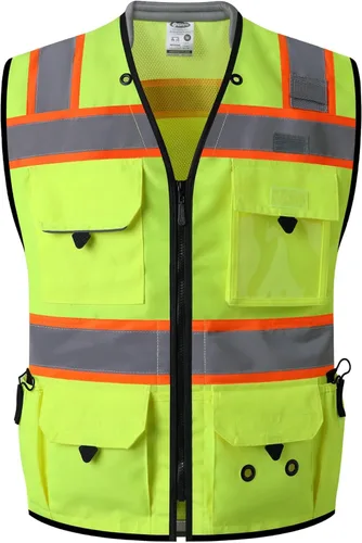 CHALECO DE SEGURIDAD PARA MÚLTIPLES FINALIDADES DE ALTO VISOR PARA TOPÓGRAFOS: El JK188 es un chaleco de seguridad de alta visibilidad y alta resistencia diseñado específicamente para ingenieros de campo y supervisores de construcción que requieren un chaleco de seguridad que cumpla con los estándares de seguridad ANSI/ISEA. El chaleco presenta una parte frontal hecha de tela Oxford 300D y una tela de malla transpirable de 120 g/m² en la parte posterior. Esta combinación garantiza durabilidad al tiempo que proporciona ventilación natural para equipos de protección personal (EPP). TU VISIBILIDAD Y COMODIDAD SON ESENCIALES: El chaleco de seguridad Surveyor está equipado con tiras altamente reflectantes de 2 pulgadas de ancho cosidas en ribetes fluorescentes extendidos. Estas tiras reflectantes han sido certificadas por un laboratorio reconocido y mejorarán tu visibilidad al brillar cuando se exponen a cualquier fuente de luz. Además, se ha incorporado un cuello acolchado a lo largo del tejido de malla para proporcionar comodidad adicional y facilitar la evaporación del calor corporal adicional. MÚLTIPLES BOLSILLOS UTILITARIOS: Este chaleco de seguridad para topógrafo está diseñado pensando en la funcionalidad de campo, con bolsillos para botellas de agua o pintura, un bolsillo utilitario de dos niveles con cuatro bolsas en el pecho derecho, un bolsillo para identificación de dos niveles a la izquierda, dos grandes bolsillos utilitarios en la parte inferior del cuerpo, dos amplios bolsillos interiores utilitarios con cremallera de dos niveles, y un bolsillo dedicado para teléfono móvil con correa de seguridad individual. Por último, un gran bolsillo con cremallera en la parte posterior para mayor espacio de almacenamiento. APLICACIÓN: El chaleco de seguridad HV es una ropa de seguridad ideal para agrimensores multipropósito para hombres, mujeres, trabajadores de la construcción e ingenieros de campo profesionales. Es un chaleco de seguridad resistente, transpirable y ligero diseñado específicamente para hombres, mujeres, trabajadores de la construcción e ingenieros de campo profesionales. RECORDATORIOS: El chaleco cumple con las normas de seguridad ANSI/ISEA, pero no cumple con las especificaciones ignífugas o antiestáticas. Siga todas las instrucciones y pautas de seguridad en su lugar de trabajo. Antes de realizar tu pedido, consulta la tabla de tallas para obtener medidas detalladas. Esto nos ayuda a reducir las huellas de carbono. Si encuentra algún defecto de fabricación, envíenos un correo electrónico para un cambio o reembolso. AÑADE AL CARRITO AHORA con confianza, ya que ofrecemos una experiencia de compra sin riesgos.