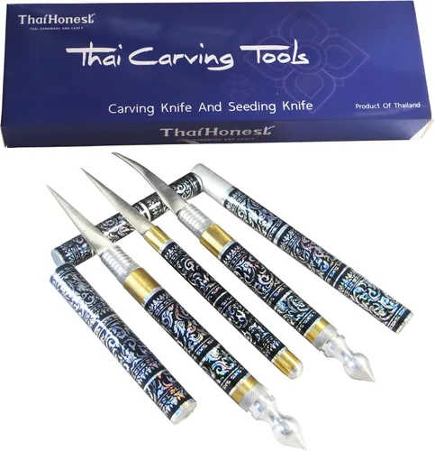 Juego de cuchillos para tallar frutas y cuchillos de siembra Producto de Tailandia. Hoja Y Vaina Hermosos Patrones Mango Tallado Latón. Perfecto para hacer delicados pétalos de rosa. Debe cuidar bien la hoja ya que puede doblarse fácilmente. Este es el cuchillo clásico de pico de pájaro comúnmente utilizado en clases y libros de talla tailandesa. La hoja rechoncha hace que esta sea una herramienta imprescindible para crear intrincadas tallas tailandesas de frutas y verduras. *** Recibirás un juego de 3 cuchillos para tallar con caja de lujo con solo en mi tienda*** Longitud del cuchillo de aproximadamente 7 pulgadas de longitud de la hoja de aproximadamente 2 pulgadas. Color: azul con piel Lai Thai. Tamaño de la caja: 9 x 3 x 1 pulgadas, hecha de papel artístico de alta calidad. ***El Balde está hecho de acero extra que es muy afilado y fuerte. *** Producto de Tailandia