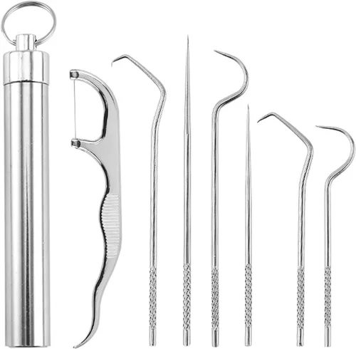 Kit de herramientas dentales de alta calidad: hecho de acero inoxidable de alta calidad, seguro y fácil de limpiar y usar. Las herramientas dentales con diferentes funciones satisfacen diferentes necesidades de limpieza dental. Limpieza a fondo: con las púas de dientes, puedes limpiar los dientes y las encías más fácil y a fondo. Ayuda eficazmente a eliminar la peste, los sarros, el cálculo dental, los desechos de los dientes y las encías, y elimina las partículas atrapadas y de alimentos entre los dientes. Diseño único: la parte inferior del palillo de dientes cuenta con un gancho redondo, conveniente para llevar para viajes, camping, picnic y algunas otras actividades. Las asas antideslizantes pueden aumentar la estabilidad en el funcionamiento y son fáciles de usar. 【Fácil almacenamiento】El kit de herramientas dentales puede funcionar para dentistas, adultos, y también para tus mascotas, gatos y perros. Con el soporte, puedes transportar y almacenar fácilmente. El paquete incluye: el kit de dientes dentales incluye palillo de dientes triangular, palillo de media luna y palillo de dientes de un personaje con un soporte para palillos para un fácil transporte.