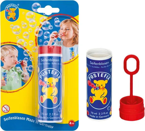 El tubo grande de burbujas PUSTEFIX de 2.35 onzas es el tamaño más grande de la versión original y más conocida de las burbujas PUSTEFIX. (Los colores de la tapa de la botella varían entre rojo, amarillo y verde). Retira la tapa con el anillo de burbujas incluido y comienza a soplar burbujas de colores arcoíris de primera calidad. PUSTEFIX ha estado fabricando juguetes de burbujas de jabón durante décadas y todos los productos están hechos con materiales e ingredientes seguros de alta calidad que hacen burbujas ultra coloridas de larga duración. Los juguetes de burbujas proporcionan diversión para todas las edades e incluso ayudan a los niños pequeños a desarrollar habilidades motoras orales, habilidades motoras finas y habilidades de seguimiento visual. Los juguetes de burbujas son ideales para divertirse al aire libre en el patio trasero con amigos y familiares en primavera o verano y también son el regalo perfecto de fiesta de cumpleaños para niños. El nombre PUSTEFIX proviene de las palabras blow and quick y verás rápidamente por ti mismo que las burbujas PUSTEFIX son sin duda las mejores del mercado.