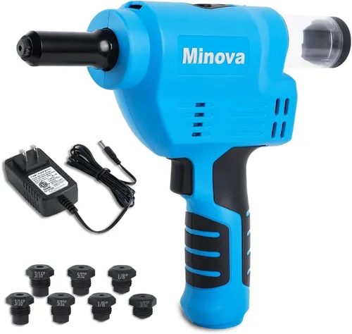 MINOVA KD-02D y KD-02DT son las pistolas remachadoras inalámbricas más ligeras. KD-02D/KD-02DT la primera solución inalámbrica que ofrece remachado rápido y fácil mientras mantiene el rendimiento, la durabilidad y el tamaño. MINOVA KD-02D y KD-02DT tienen un mango equilibrado y ergonómico y están diseñados para un fácil uso y almacenamiento de piezas nasales a bordo. MINOVA KD-02D y KD-02DT son compatibles con remaches de varios tamaños, incluyendo remaches de 3/32 pulgadas (0.094 in), 1/8 pulgadas (0.126 in), 5/32 pulgadas (0.157 in) y 3/16 pulgadas (0.189 in), adecuados para todos los materiales remaches ciegos, incluyendo aluminio, acero y acero inoxidable. MINOVA Las herramientas de remache de batería tienen un colector de mandril diseñado para recoger y almacenar mandriles sueltos El kit de herramientas incluye: 1 mango de remachador inalámbrico KD-02D/KD-02DT, 4 piezas de nariz comunes 3/32 "(2.4 mm), 1/8 "(3.2 mm), 5/32" (4.0 mm) y 3/16" (4.8 mm), 3 piezas de nariz anti-off 1/8" (3.2 mm), 5/32" (4.0 mm) y 3/16" (4.8 mm) mm), Extra 3 clics Aws para reemplazo, 10 remaches de 1/8 "(3.2 mm), 10 remaches de 5/32 pulgadas (0.157 in), 1 cargador MINOVA Consejo: Cuando esté en uso, asegúrese de instalar el colector de mandriles en la herramienta de remache. Las herramientas de remache MINOVA están equipadas con un micro interruptor, y el colector de mandriles DEBE ensamblarse antes de que se pueda usar la herramienta.